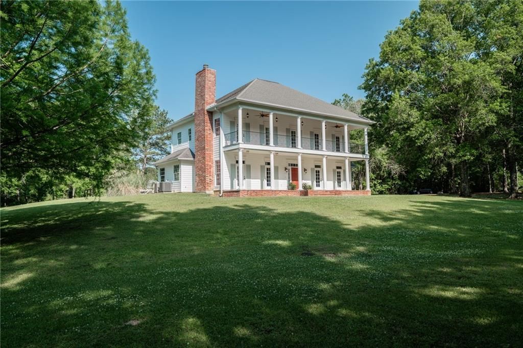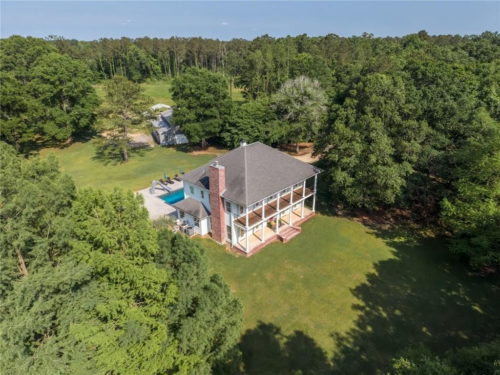 Set high on a gentle hill and surrounded by 19 groomed acres, this stately custom-built, 5139 sq/ft total Colonial estate offers privacy, beauty, & room to breathe. A grand front porch & second-floor balcony overlook a manicured lawn and stocked pond framed by cypress and hardwood trees, blueberry bushes, and blooming camellias creating a setting that feels both refined and peaceful. Inside, thoughtful design and craftsmanship are evident throughout. The kitchen features abundant cabinetry, an island bar, granite countertops, and stainless appliances including a KitchenAid range oven, wall oven, and two microwaves and butler's pantry. Natural lighting is abundant . The main level offers hand-scraped oak flooring and slate tile, a formal dining room, formal living room with fireplace, & a recreation room complete with built-in double desks & bookcases. A downstairs primary suite includes private laundry connections for added convenience. Upstairs, the primary suite features surround sound, direct access to the expansive balcony, dual walk-in closets, and an ensuite bath with dual vanities, a jetted soaking tub, and an oversized multi-head porcelain-tiled shower. Spacious secondary bedrooms provide flexibility, with the fifth bedroom showcasing vaulted ceilings and a loft. From the full-length balcony, the view across the pond and grounds is truly breathtaking. Outdoor living is equally impressive. The oversized garage includes doors on both sides, with one opening toward the in-ground gunite pool, ideal for gatherings and seamless indoor-outdoor entertainment. Behind the home, a 1,800 ft2 metal workshop offers an insulated, climate-controlled space with a full bath, a potential garage apartment. The property also includes a covered RV port and a fenced pasture with a 20x30 stable. This property does not require flood insurance and has never flooded. A rare opportunity to own a private estate that blends elegance, recreation, and country living without compromise.
